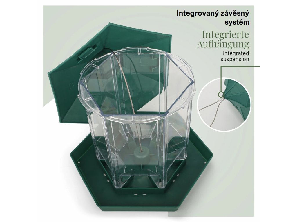 S tímto velkorysým ptačím krmítkem můžete svým opeřeným přátelům nabídnout prostorný jídelní kout. Lucerna pro domácí krmení volného ptactva má působivou kapacitu pro krmení obilím, ořechy nebo moučnými červy. Víko chránící před deštěm a průhledné krmné silo spolehlivě chrání krmivo pro ptáky před vlhkostí a znečištěním. To znamená, že jídlo zůstane vždy čerstvé a chutné. Krmítko je ideální pro sýkorky, vrabce, pěnkavy a mnoho dalšího volně žijícího ptactva, které přilétá na vaši zahradu. Snadno se zavěsí a snadno se plní. Připravte se přivítat pestrou paletu opeřených návštěvníků a užijte si podívanou na jejich řádění na vaší zahradě.