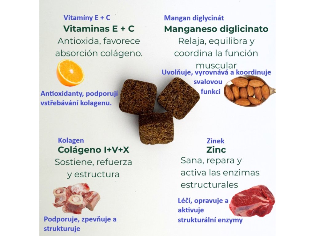 - Unikátní, kompletní a synergické složení: spojuje chondroprotektory, přírodní protizánětlivé látky i antioxidanty.