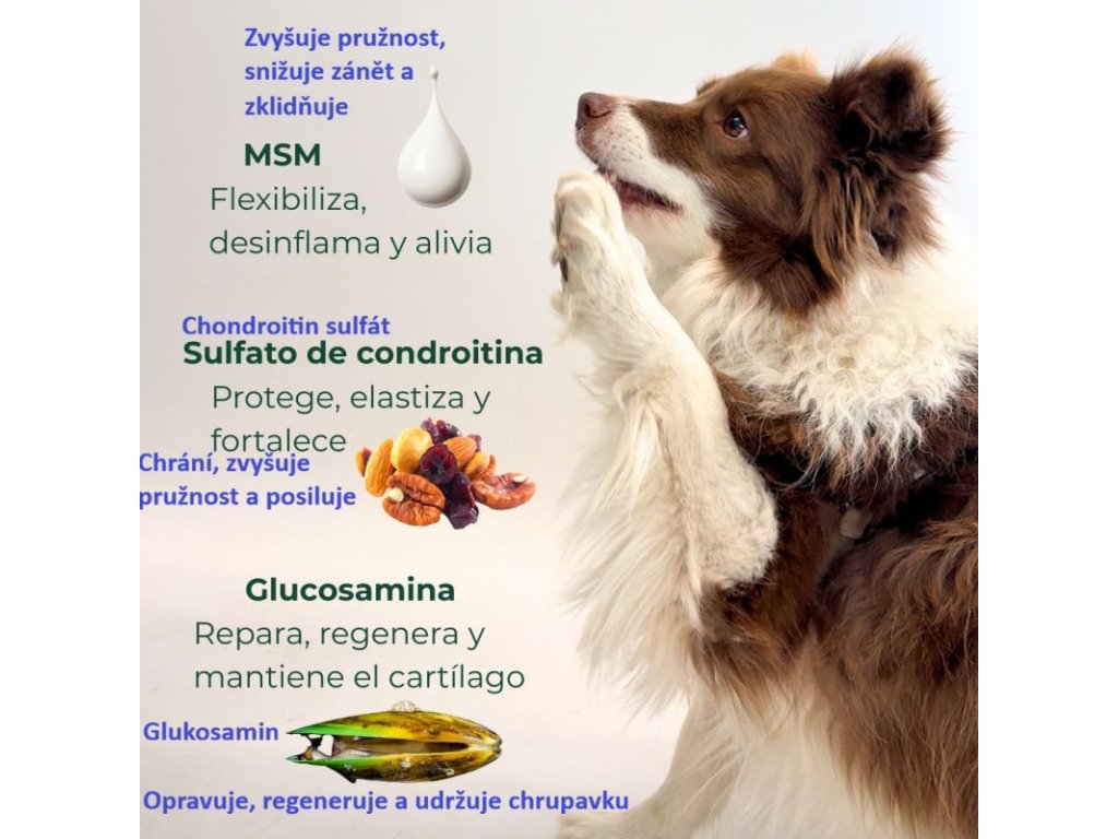 Po dvou letech vývoje a ve spolupráci s veterináři specializovanými na traumatologii a rehabilitaci vznikl kompletní doplněk stravy, který v jednom produktu spojuje nejúčinnější a vědecky podložené látky pro zdraví kloubů psů:
