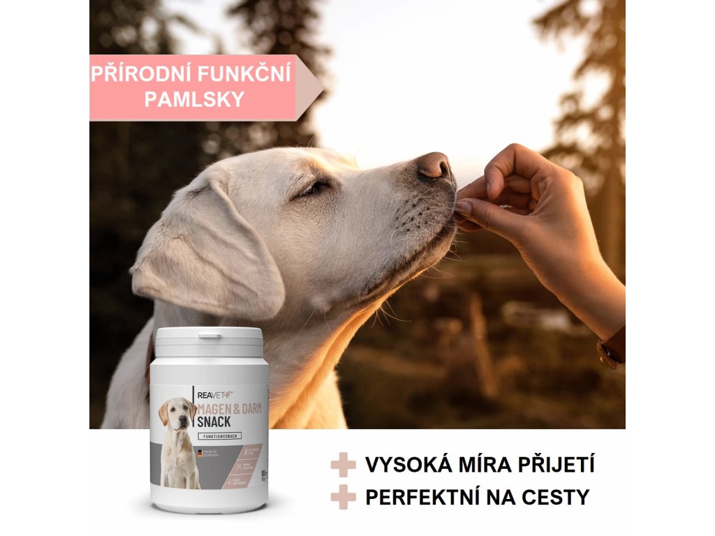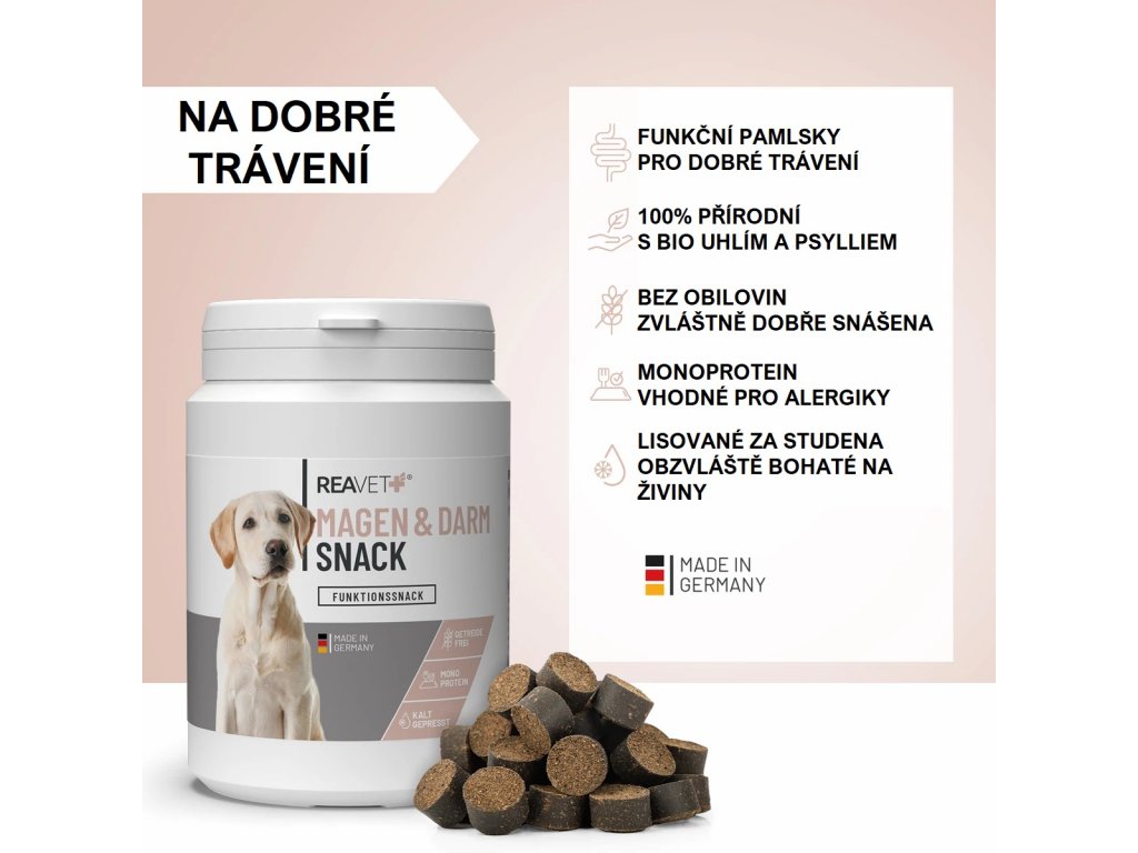 Nejen špatné krmivo, ale i stresové situace a strach dokážou vašemu psovi zacloumat s žaludkem a střevy. Naše žaludeční a střevní funkční pamlsky REAVET nejen že mimořádně dobře chutnají, ale přispívají i k harmonizaci činnosti trávicího traktu. Naše vynikající receptura obsahuje cenné ingredience, jako je rostlinné uhlí a na živiny bohaté slupky psyllia, které mohou podpořit gastrointestinální funkci vašeho psa.