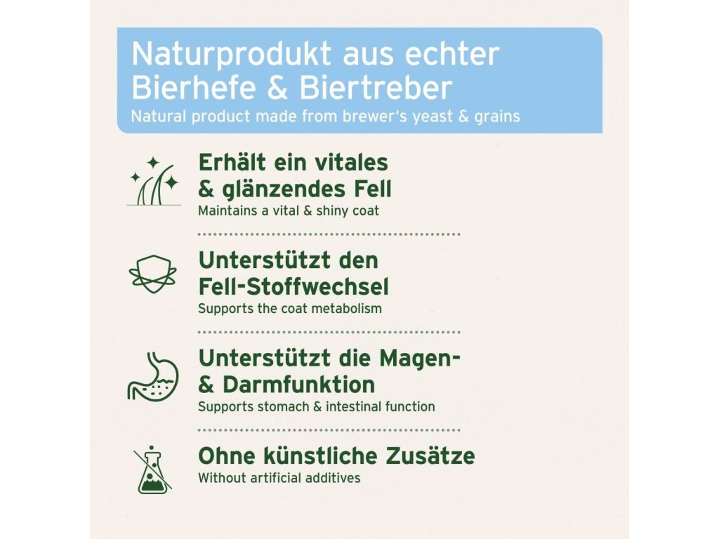 AniForte® pivovarské kvasnice BT Pur dodávají přírodní pivovarské kvasnice, které jsou speciálním procesem navázány na nosnou látku pivovarského mláta a šetrně vysušeny. Vysoce kvalitní mláto poskytuje cenné živiny a může mít podpůrný účinek při přechodných poruchách kůže, srsti a také gastrointestinálních potížích. Pivovarské kvasnice AniForte® BT Pur, které se skládají ze 40 % pravých pivovarských kvasnic a 60 % vysoce kvalitního mláta, jsou užitečným doplňkovým krmivem nejvyšší kvality.