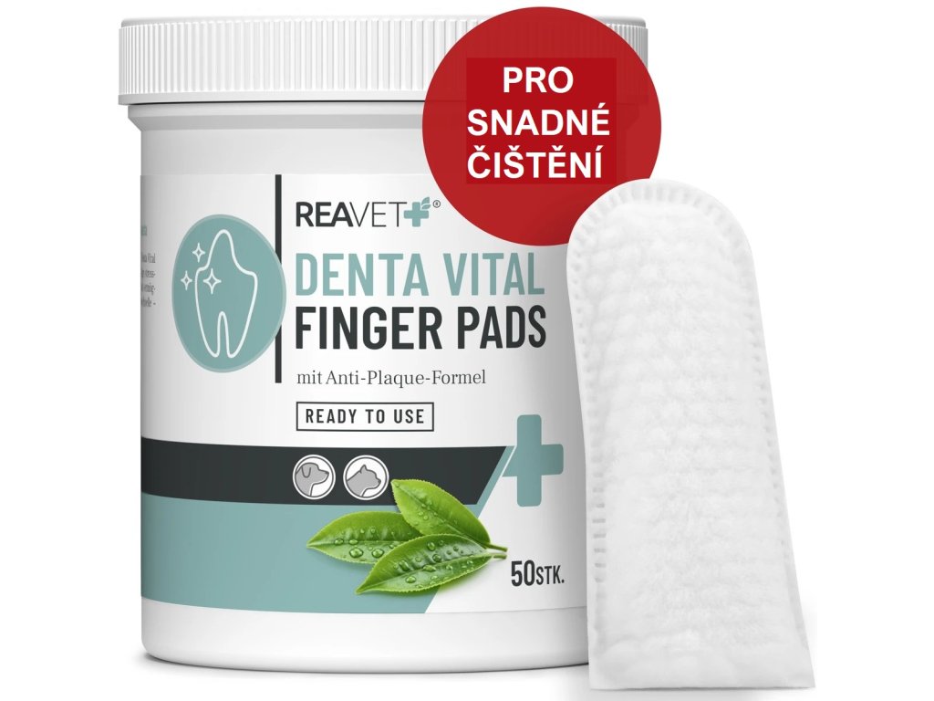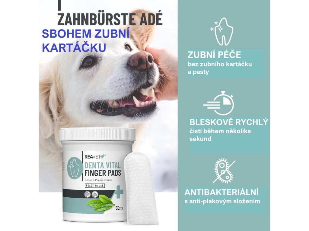 Zapomeňte na zubní kartáček s pastou – s našimi REAVET Denta Vital prstovými polštářky je péče o zuby vašeho chlupatého kamaráda bez stresu a bleskově rychlá. Tyto praktické jednorázové polštářky na prsty umožňují efektivní čištění zubů, které už nebude trvat tak dlouho jako s kartáčkem a bude tak pro Vašeho mazlíčka méně stresující.
