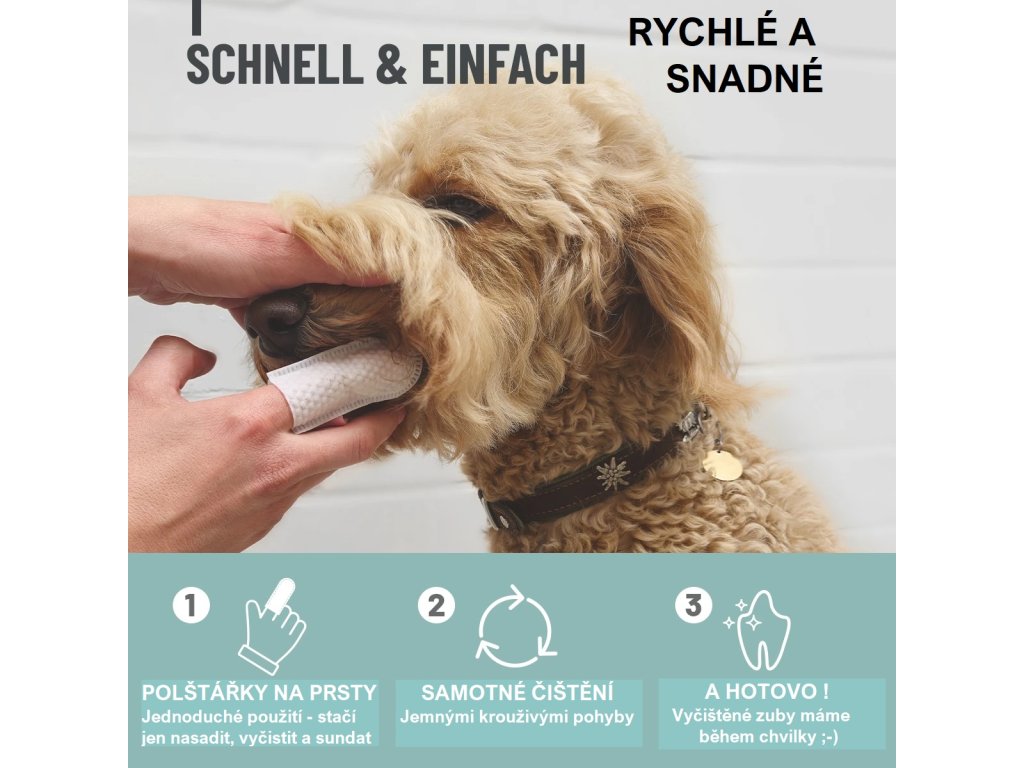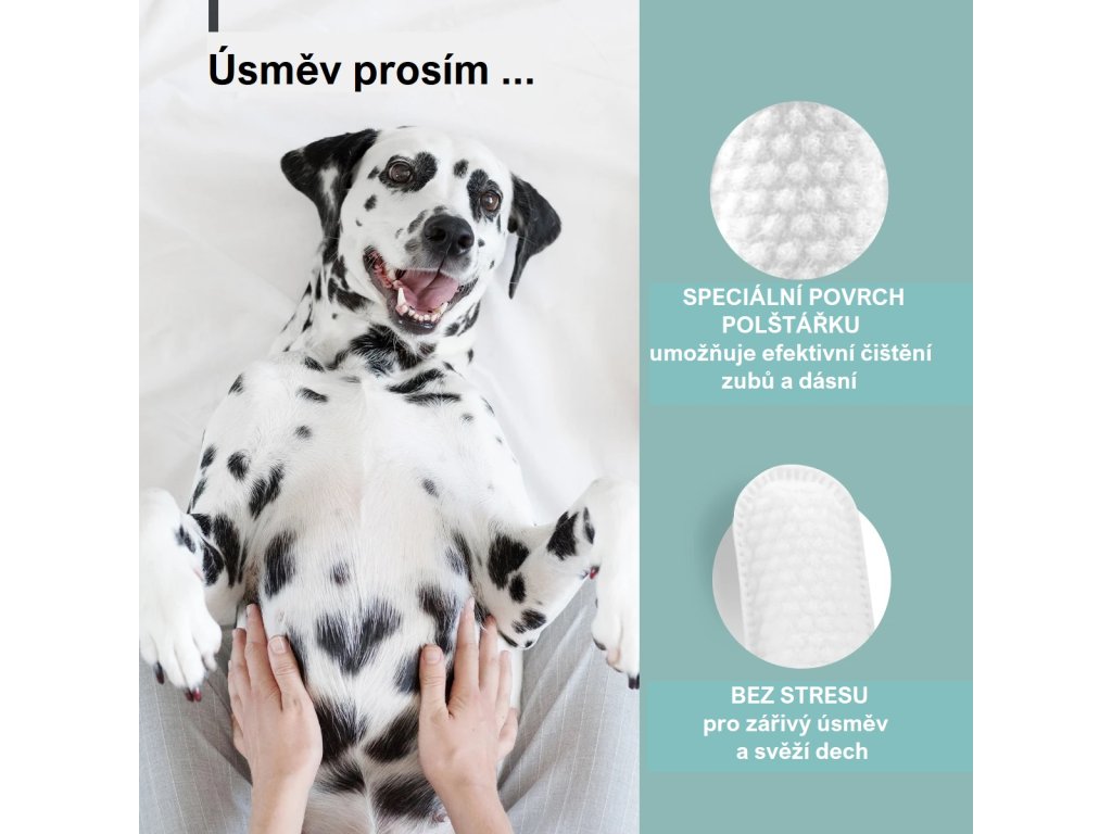 PRO KRÁSNÉ ZUBY A SVĚŽÍ DECH : S našimi jemnými polštářky na prsty se péče o zuby stane nekomplikovanou součástí vaší každodenní rutiny. Měkká a pružná textura polštářků chrání dásně a zuby – ideální pro citlivé domácí mazlíčky.