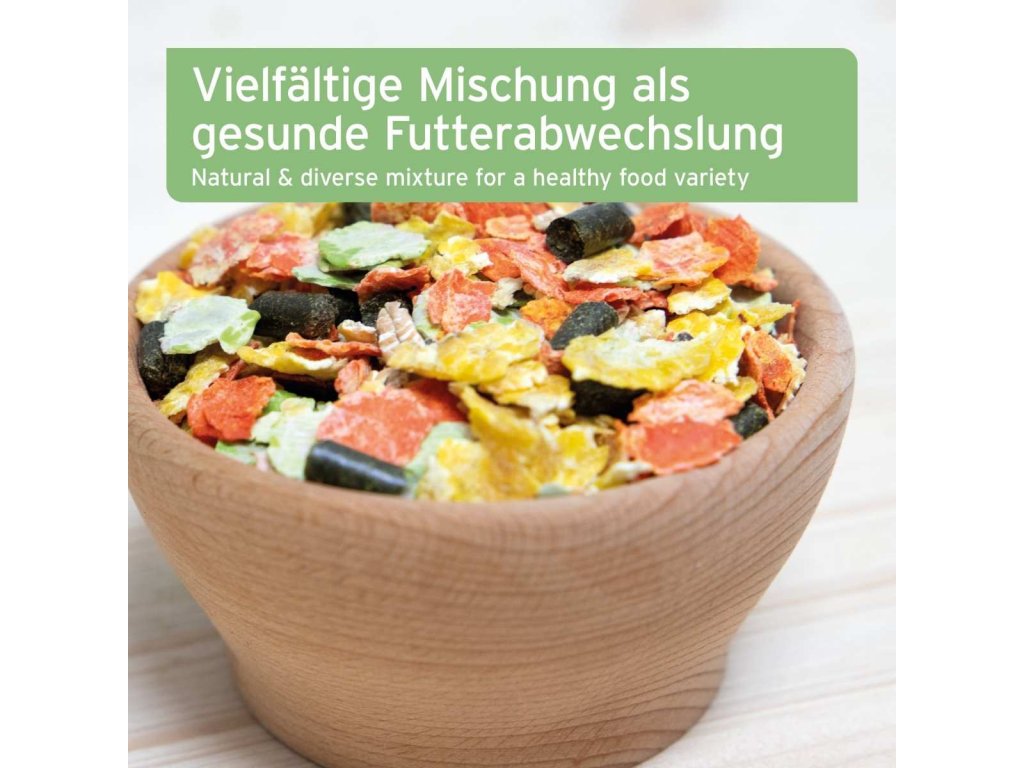 - Rozmanitá směs zeleninových vloček, obilovin, vojtěšky a bylinek.