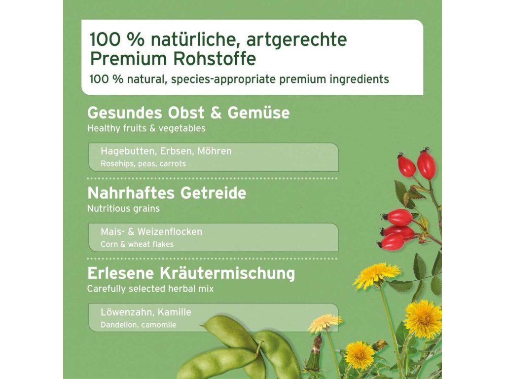 Kukuřičné vločky, hrachové vločky, mrkvové vločky, vojtěškové pelety, pšeničné vločky, bylinková směs (zázvor, kmín celý, pískavice celá, fenykl, šípkový řez, ostropestřec, listy rozmarýnu, přeslička, tymián třený, heřmánek jemně řezaný), bylina pampeliška s kořenovým řezem