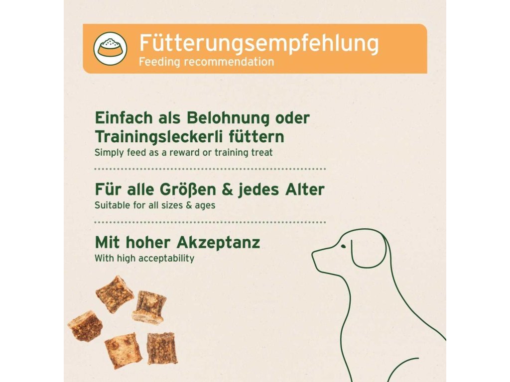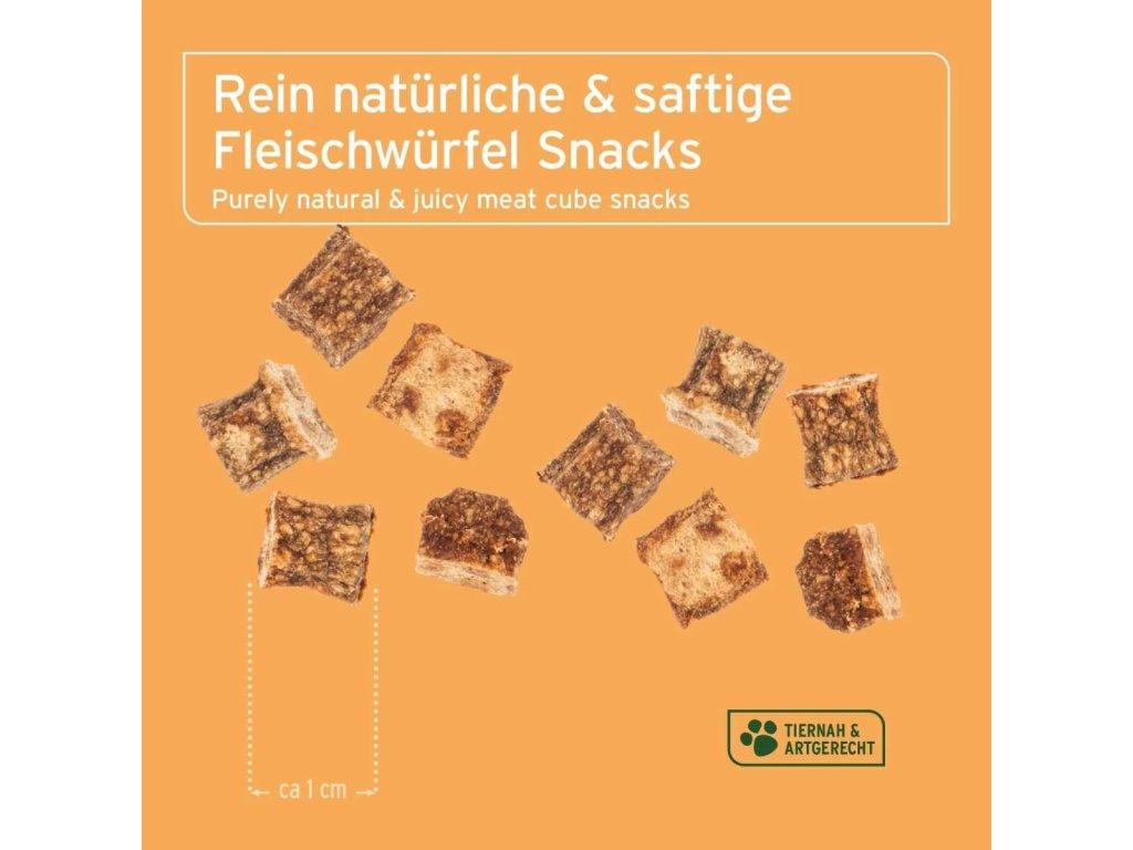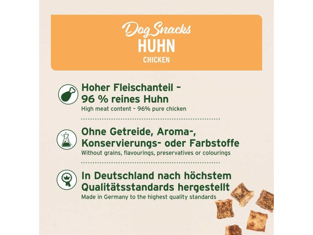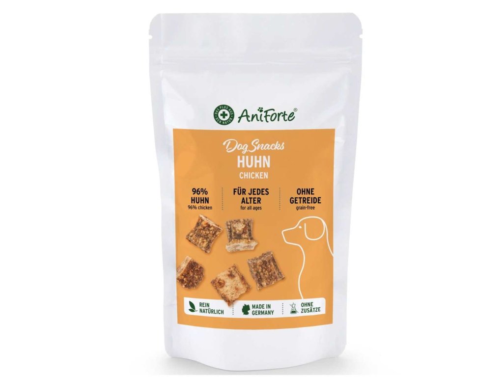 AniForte® Dog Snacks Chicken poskytují vašemu čtyřnohému příteli kuřecí maso jako jediný zdroj bílkovin. Masové kostky neobsahují žádné přísady a jsou vašimi chlupáči velmi dobře přijímány díky své chuti a intenzivnímu aroma.