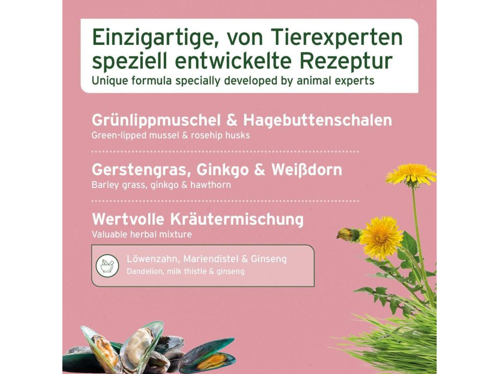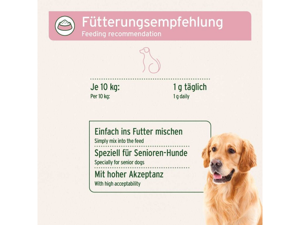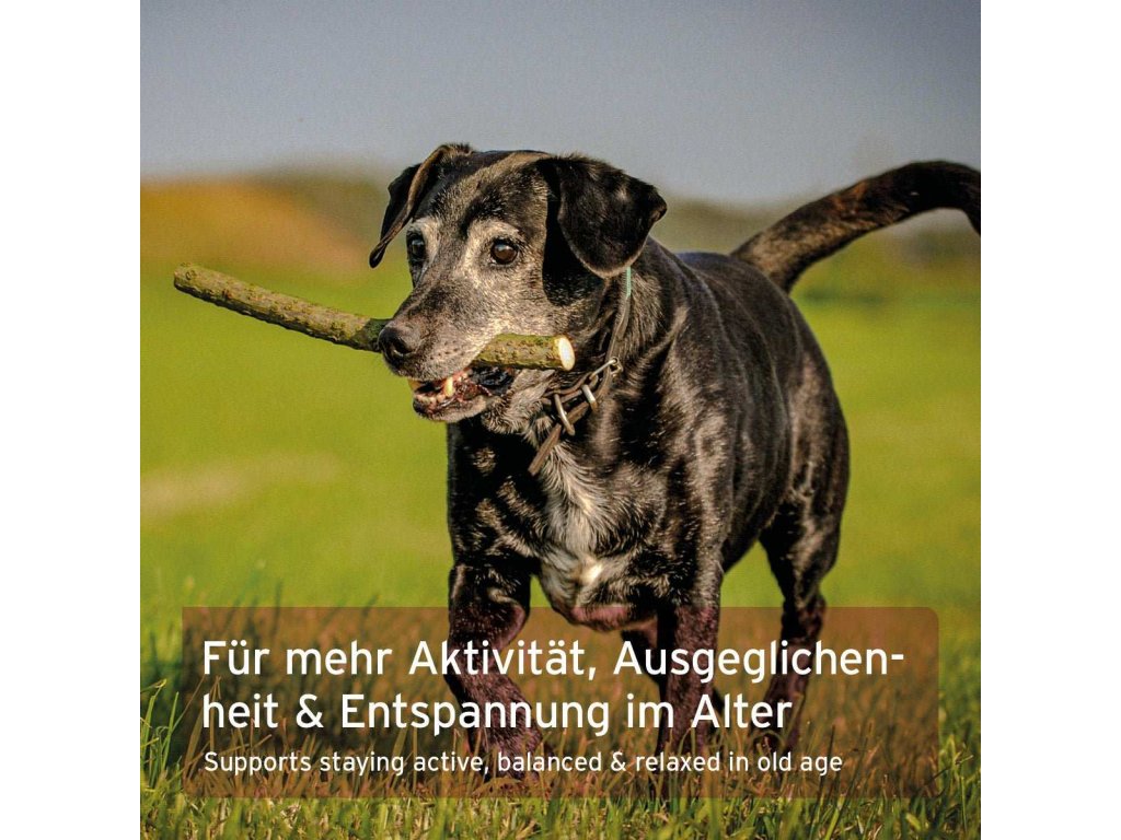 Starší psi mohou vykazovat různé známky stárnutí a mít různé nutriční potřeby. Abychom podpořili přirozenou pohyblivost a pohodu vašeho čtyřnohého přítele, AniForte® Senior Active poskytuje ty nejlepší ingredience pro optimální péči o vašeho psa ve stáří. S cennými ingrediencemi, jako je slávka zelenoústá a slupky z šípků, přírodní produkt podporuje agilitu a imunitní systém vašeho psa. Mleté listy ginkga mají navíc pozitivní vliv na paměťové funkce a celkovou fyzickou kondici psů seniorů. Řezané listy hlohu doplňují zásoby vašeho psa a osvědčily se v podpoře normální činnosti srdce.