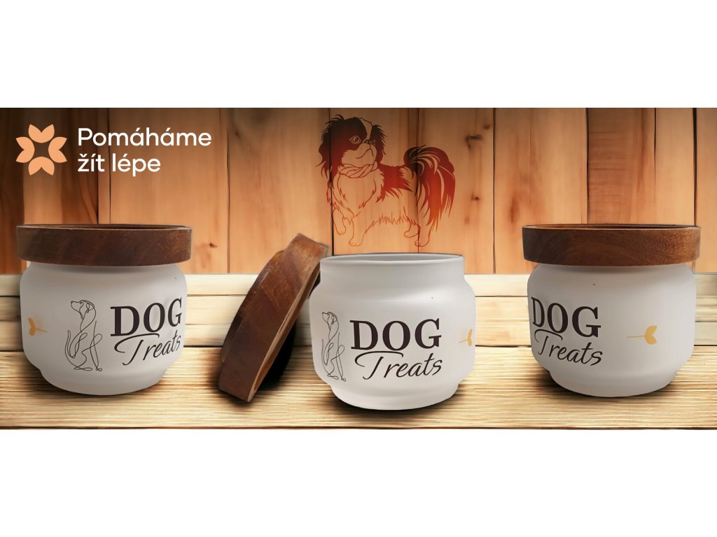 Skleněná dóza / nádoba z matného skla na psí pamlsky / granulky s dřevěným víčkem o objemu 750 ml.