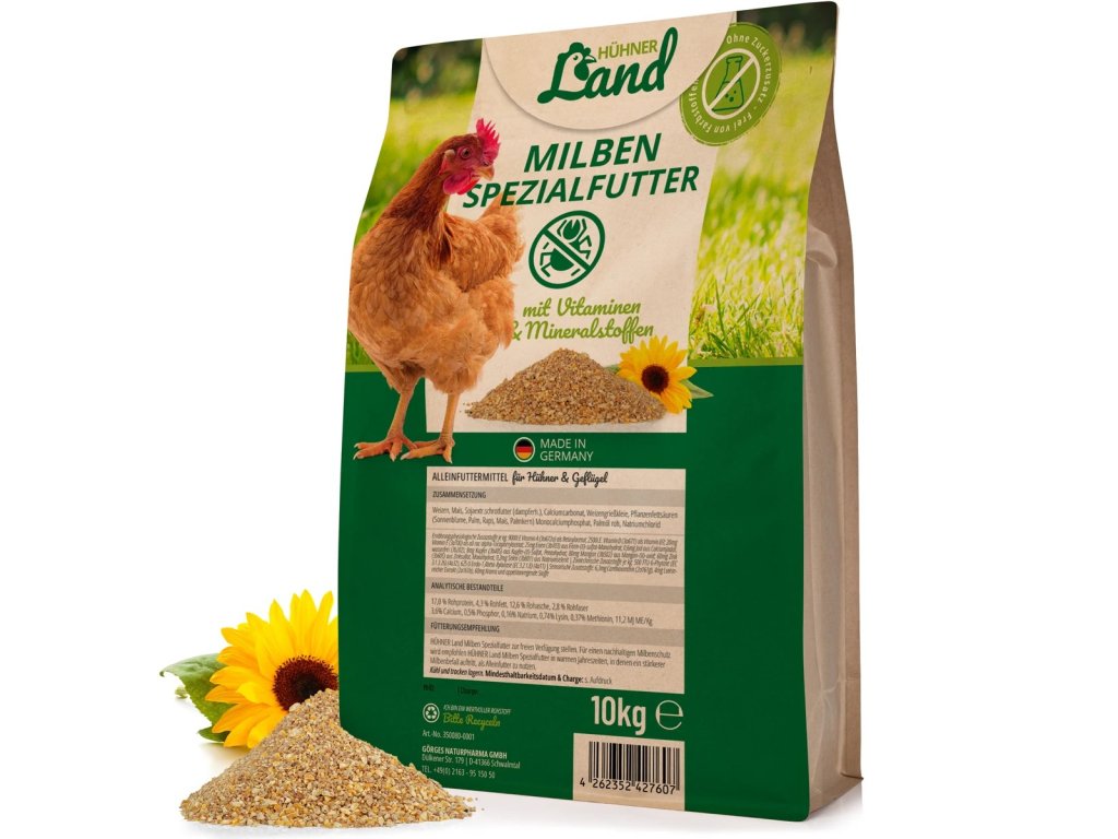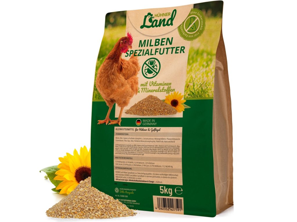 Naše speciální krmivo pro drůbež HÜHNER Land Mite je druhově vhodné komplexní krmivo pro drůbež s řadou lahodných pochoutek. Vyvážená směs cenných surovin je nejen obzvláště oblíbená u drůbeže, ale je také velmi výživná. Obsažené ingredience jsou našimi statečnými vojáky v boji proti roztočům. Obsažený uhličitan vápenatý, který se získává z ústřicových lastur, má také mnoho pozitivních vlastností.