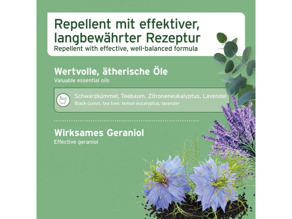 Voda (dem.), olej z černého kmínu, citronový eukalyptový olej, levandulový olej, geraniol, tea tree olej, solubilizátor