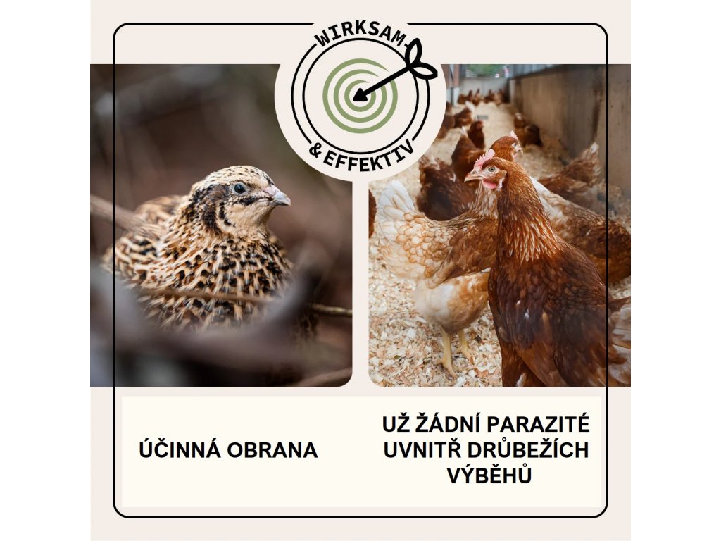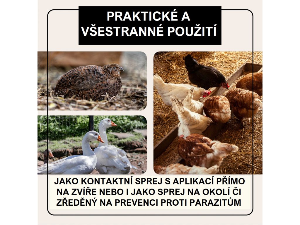 - Vhodné také jako ekologický sprej pro prevenci (i pro postřik okolí a prostředí, v kterém se drůbež nachází)