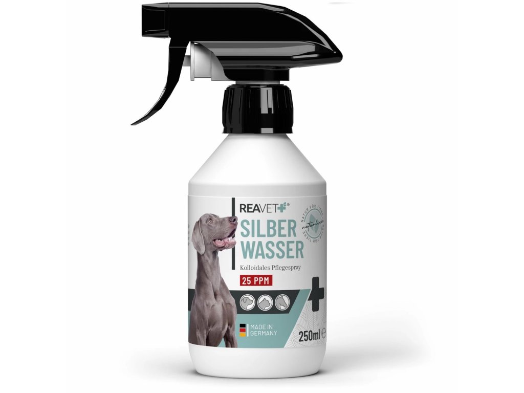 REAVET stříbrná voda ve spreji pro psy, kočky a koně je vhodná k čištění a péči o kůži. Stříbro díky svým vlastnostem nabízí optimální podporu pro kůži při každodenních zvířecích incidentech či hrátkách. Vzhledem k antimikrobiální účinnosti nanostříbra je stříbrná voda doporučována pro péči o pokožku a péči o rány.