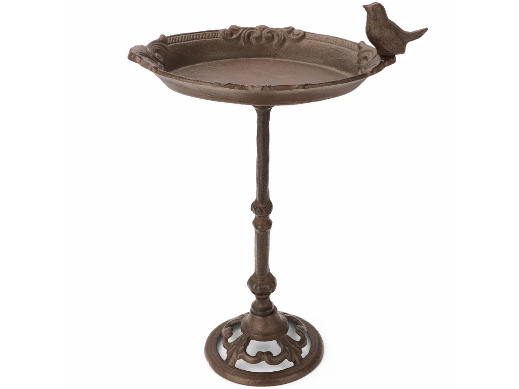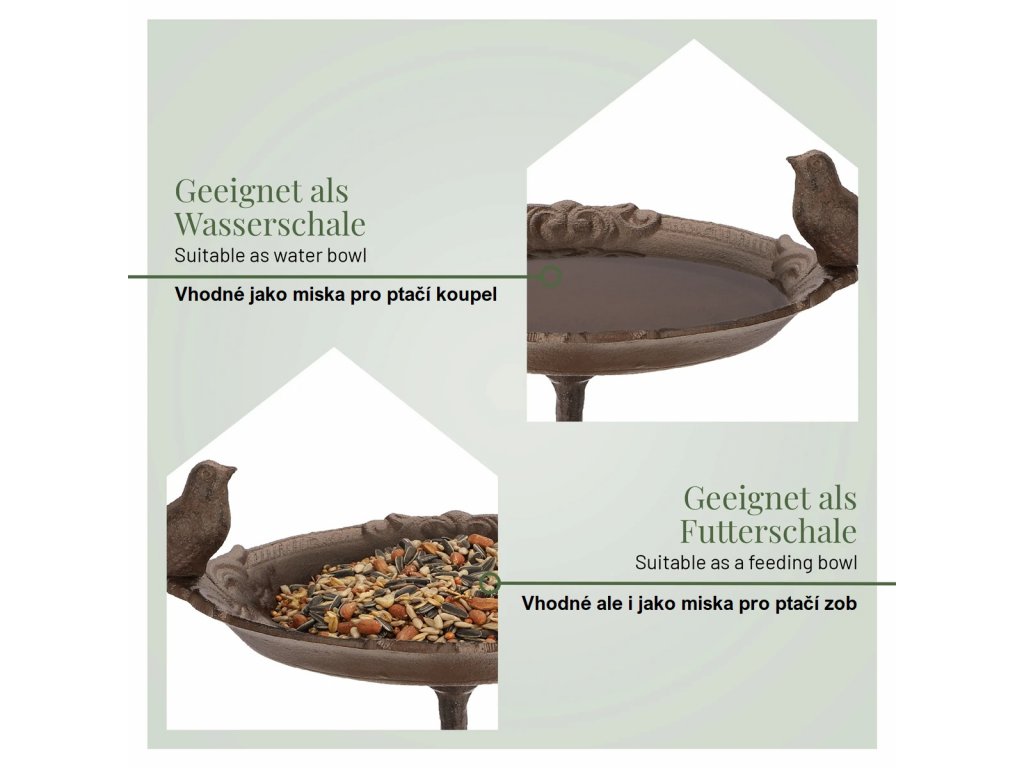 Koupel pro ptáky je vyrobena z litiny a byla vyrobena bez použití barev i jiných chemikálií. Mírná tvorba rzi po použití je normální a neškodná. Tato povrchová rez je pro zvířata a lidi zcela neškodná i při konzumaci a po pár dešťových přeháňkách sama zmizí.