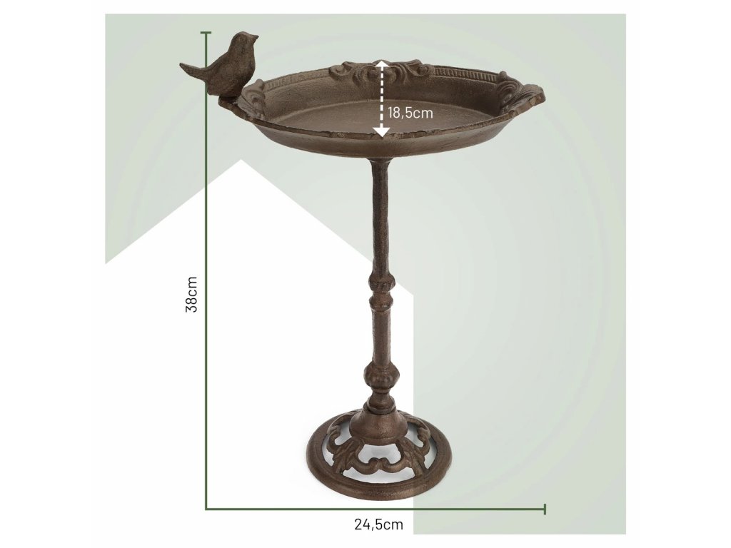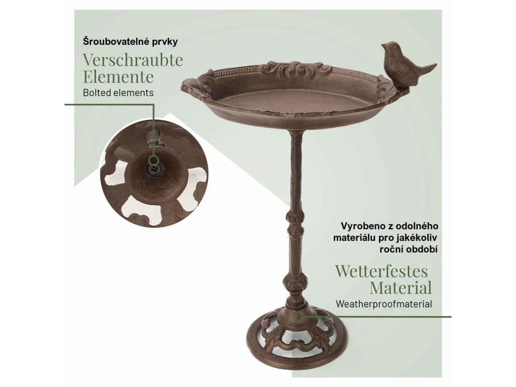 Vyrobeno z robustní litiny. Tento zahradní doplněk je nejen mrazuvzdorný, ale odolává i všem povětrnostním vlivům. Díky své robustnosti je naše vana pro ptáky téměř nezničitelná a může snadno zůstat venku po celý rok, a to i během chladných zimních měsíců.