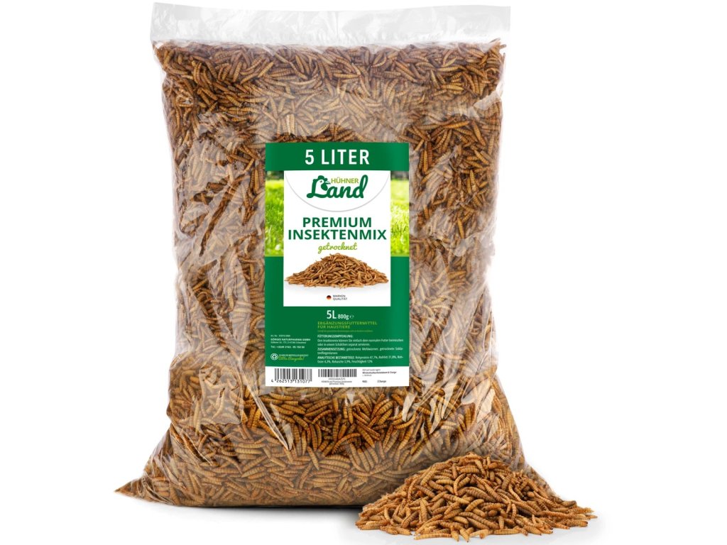 Se směsí HÜHNER Land Premium Insect Mix dopřejete své drůbeži přesně to, co potřebuje pro energii, růst a vitalitu. Tato prémiová směs 100% přírodních moučných červů a larev černých vojenských much je bohatá na kvalitní bílkoviny, vitaminy a minerály – ideální jako každodenní doplněk stravy i chutná přírodní svačinka.