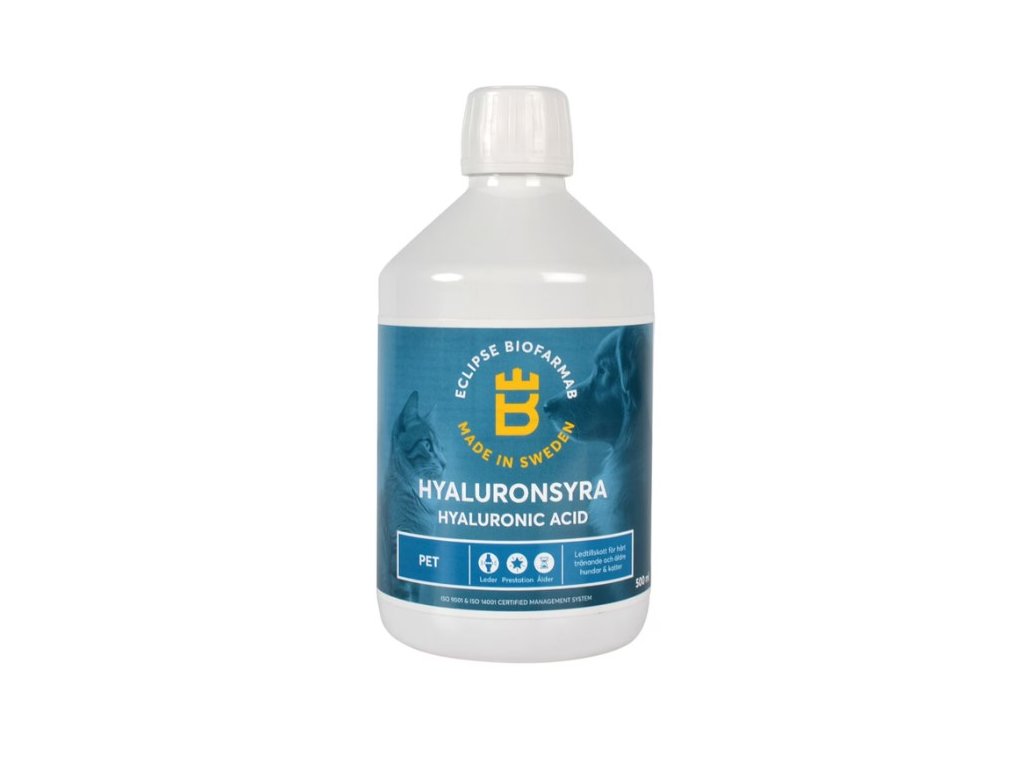 Eclipse Biofarmab Hyaluronic Acid pro psy a kočky je tekutá kyselina hyaluronová s vysokou molekulovou hmotností. Používá se k zachování normální funkce kloubů. Kyselina hyaluronová je přirozeně přítomna v synoviální tekutině, kde má tlumicí a lubrikační funkci.