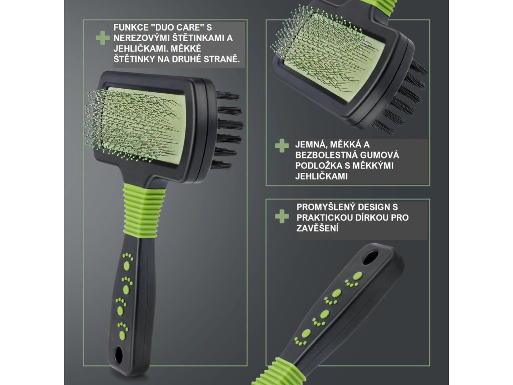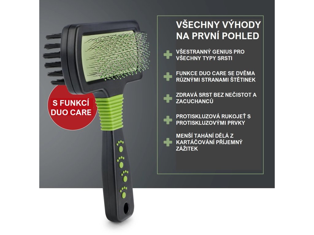 S funkcí Duo Care - Strana kartáče s nerezovými piny odstraňuje odumřelou srst a uzlíky – bez jakéhokoli škubání. Díky speciálně tvarovaným hrotům je odumřelá srst jemně vytažena, aniž by došlo k poškození vrchní srsti. Druhá strana kartáče s integrovanými měkkými štětinami je ideální pro vyhlazování a vyčesávání nečistot a zajišťuje krásný lesk. Díky protiskluzové rukojeti padne náš kartáč pohodlně do ruky každého z vás. Tím umožňuje snadné použití i při delším vyčesávání.