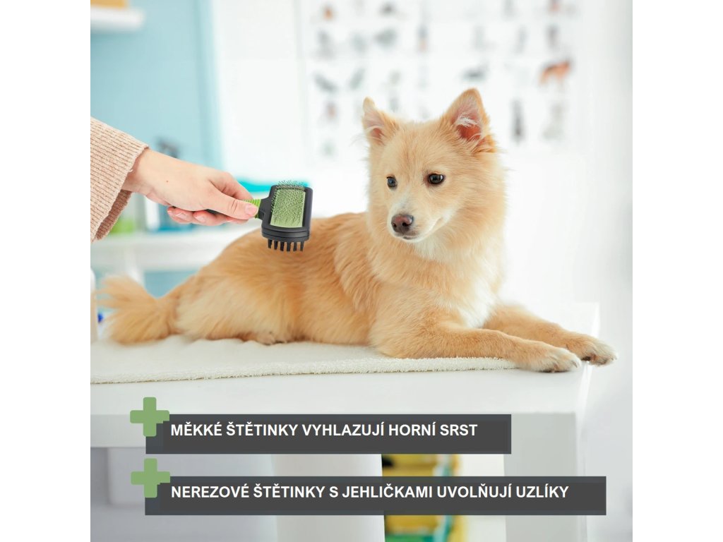 Díky kombinaci měkkých štětin a odolných čepů z nerezové oceli je náš kartáč skutečně všestranný. Jemné štětiny zajistí nejen zářivý lesk, ale pomohou též jemně odstranit nečistoty a uhladit srst Vašeho mazlíčka. Nerezové špendlíky zároveň umožňují snadné rozmotávání a uvolňování uzlů bez namáhání nebo tahání srsti. Měkké kolíky jsou ideální pro citlivá zvířata a dělají z kartáčování příjemný zážitek