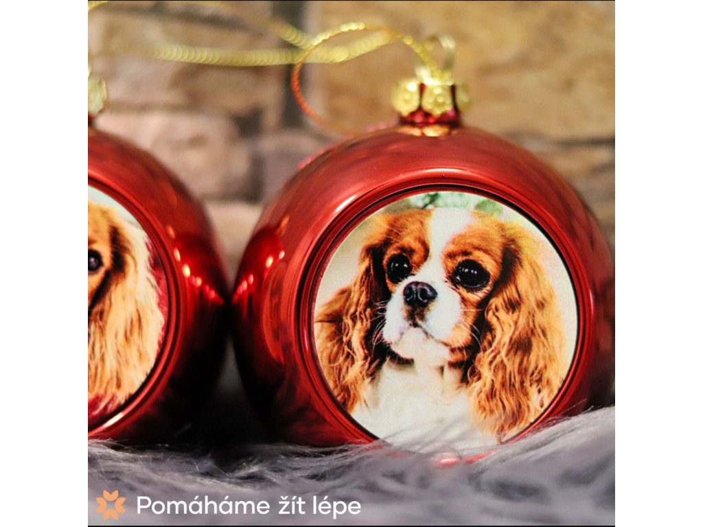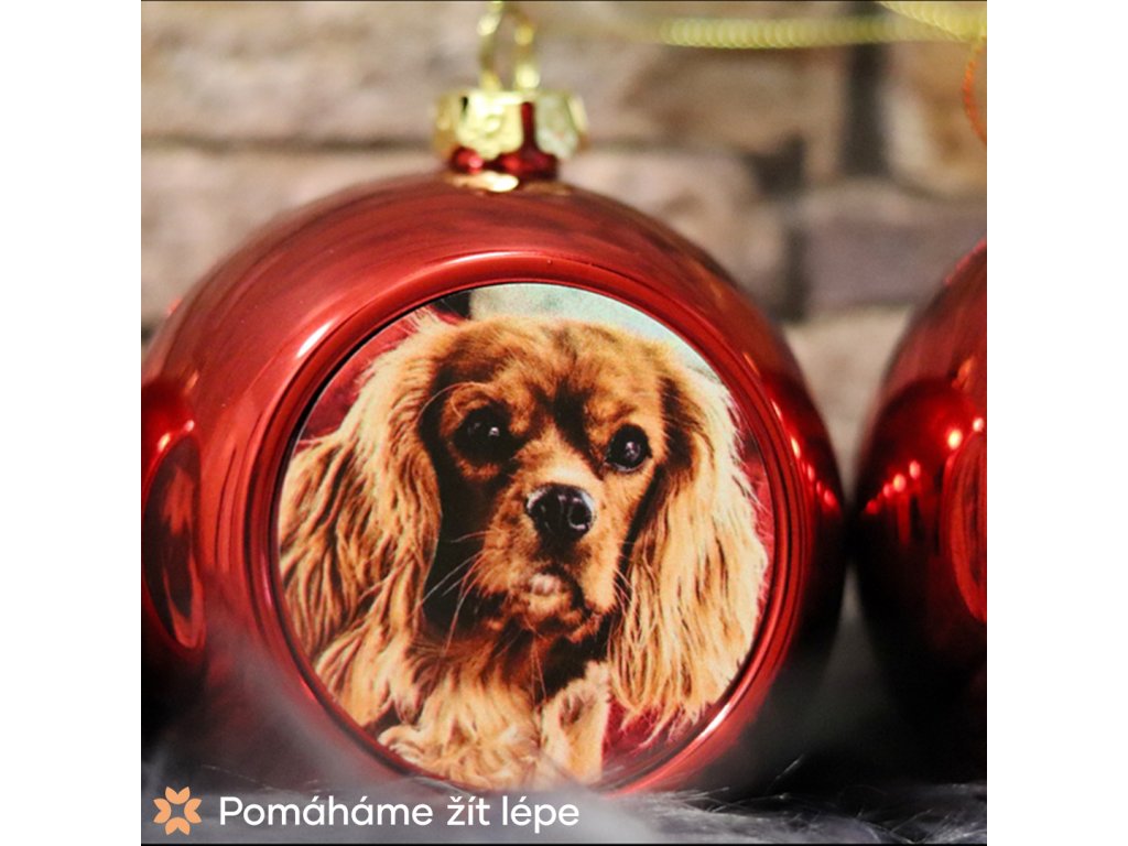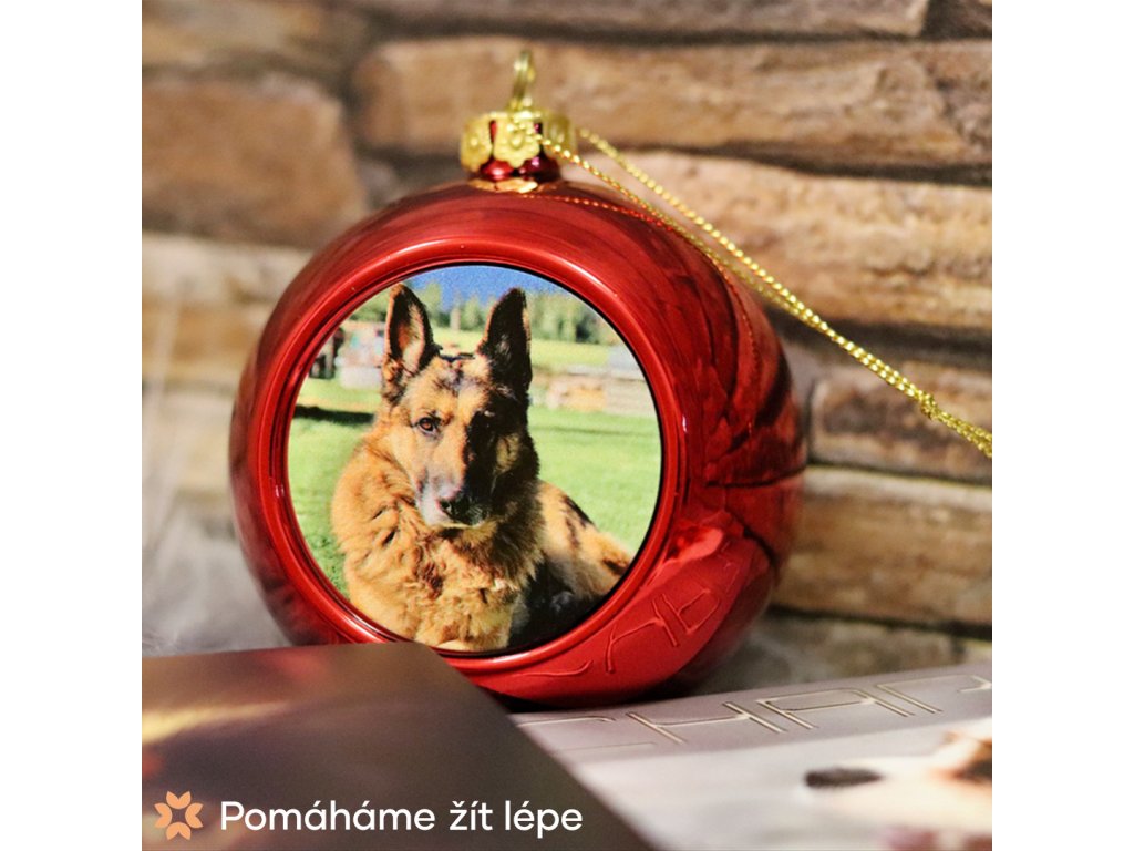 Červená vánoční baňka s vlastním fotem o průměru 6 cm.