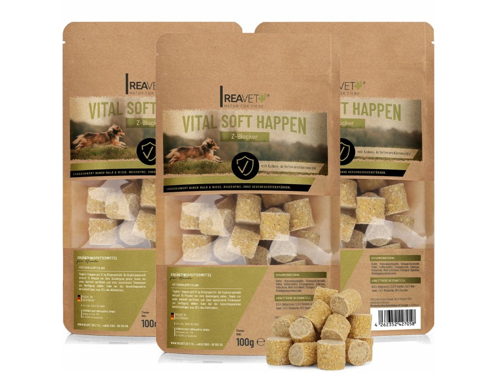 Naše REAVET Vital Soft Happen - Z-Blockers jsou ideálními společníky na procházky v lese a na loukách a jsou ideální jako chutná odměna mezi tím. Tyto jedinečné pamlsky jsou nejen lahodné, ale obsahují také pečlivě vybranou směs oleje z černého kmínu a kokosu. Jsou snadno stravitelné a jsou vyrobeny z nejlepších surovin, aby byla zajištěna optimální snášenlivost. Pro lepší snášenlivost nepoužíváme pšenici - proto jsou naše Z-Blocker Vital Soft Happen perfektní i pro psy s potravinovými alergiemi a intolerancí.