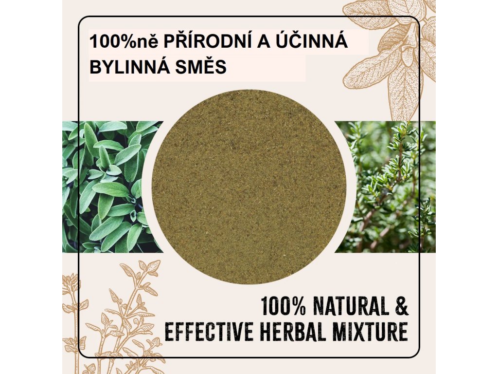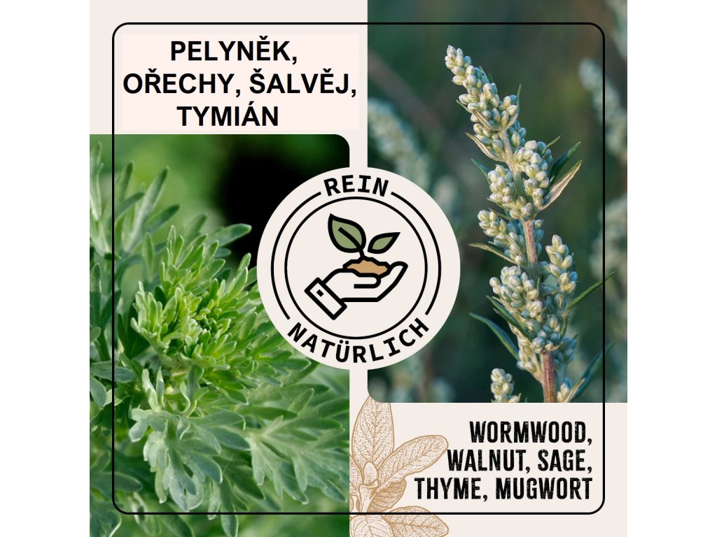 Jemné části: mrkev; 15% listy šalvěje; listy vlašského ořechu; petržel; 10% tymián; 10% pelyněk; 5% pelyněk
