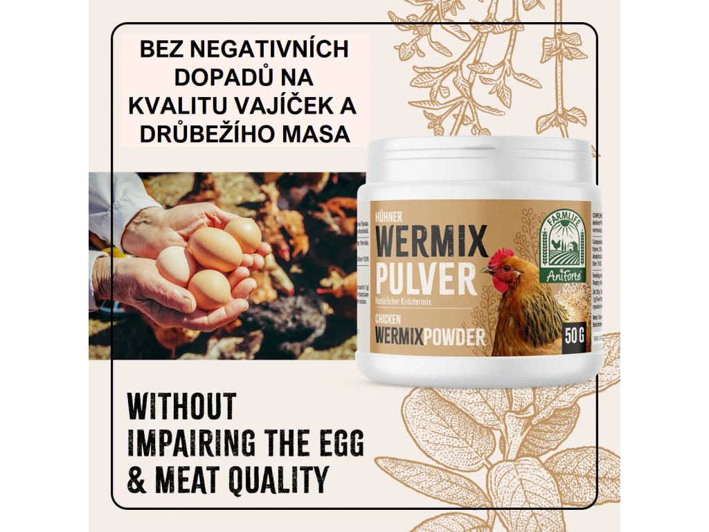 AniForte® WermiX obsahuje pouze rostlinné složky, jako je tymián, pelyněk, pelyněk a šalvěj a je zvláště podpůrný po vyléčeném napadení červy. Nikterak negativně neovlivňuje kvalitu drůbežího masa ani vajíček.
