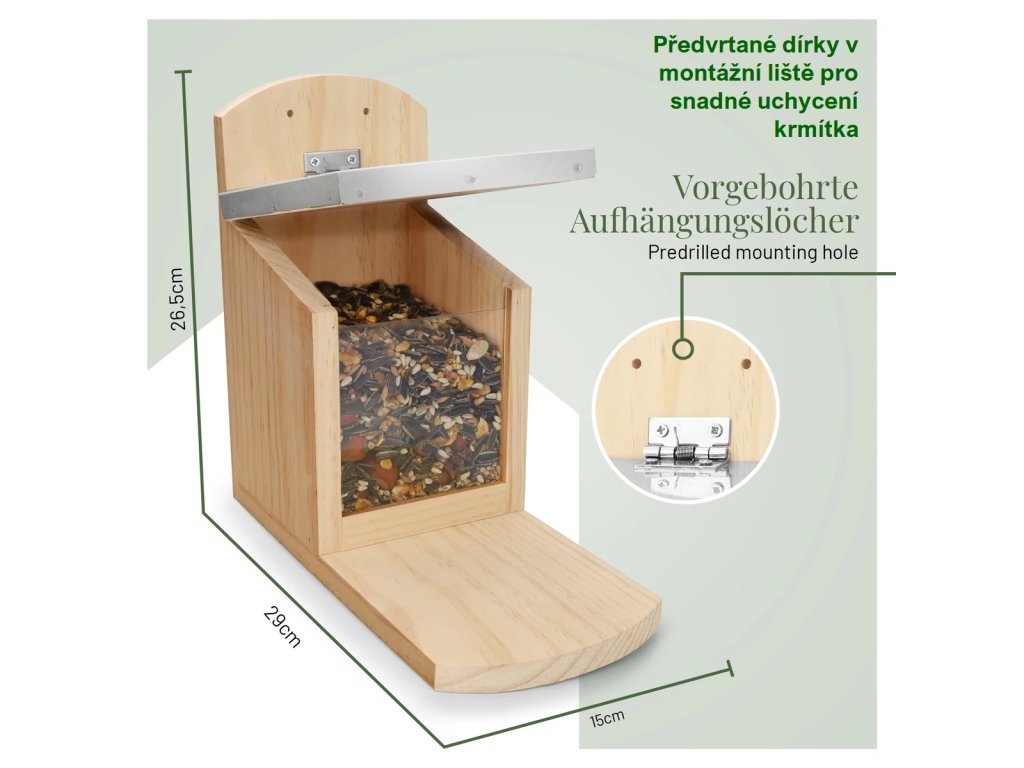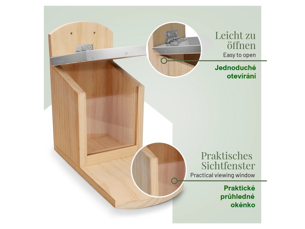 Tento promyšlený design vytváří ideální prostředí pro nerušené pozorování veverek. Prostorná krmná stanice vybavená zkráceným plexi okénkem a odklápěcím víkem zajišťuje, že krmivo je dobře vidět a zvířata k němu mají bezpečný přístup. Krmítko lze také snadno doplňovat, aby měli vaši malí hosté vždy čerstvou porci toho nejlepšího, co jim můžete nabídnou (viz související produkty).