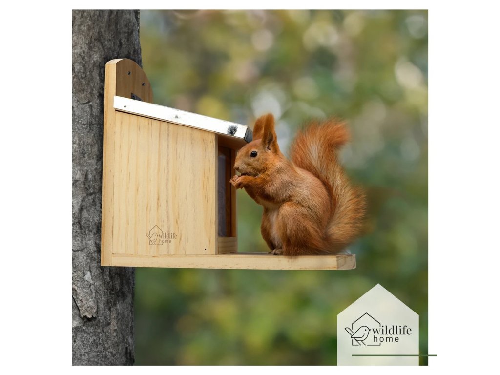 XL Krmítko pro veverky z borovicového dřeva, s kovovou střechou