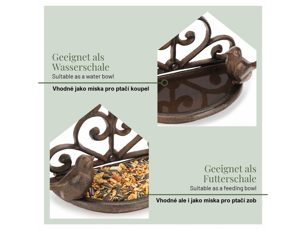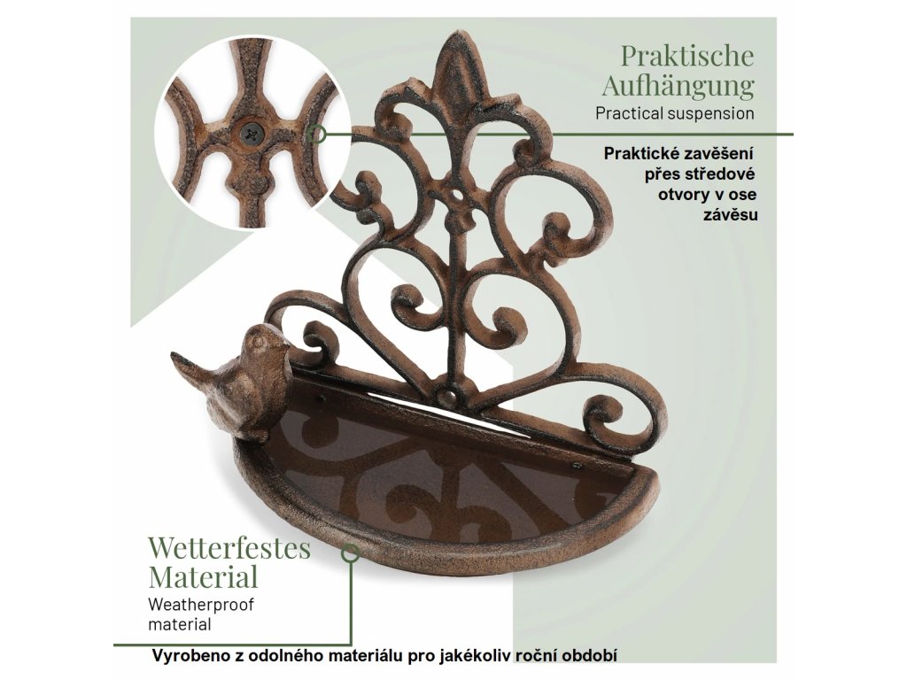 Vyrobeno z robustní litiny. Tento zahradní doplněk je nejen mrazuvzdorný, ale odolává i všem povětrnostním vlivům. Díky své robustnosti je naše vana pro ptáky téměř nezničitelná a může snadno zůstat venku po celý rok, a to i během chladných zimních měsíců.