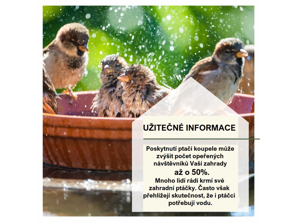S ptačí koupelí můžete pozvat ptáčky do vaší zahrady nebo na balkon a sledovat, jak se koupou a pijí. Protože přirozené vodní plochy v mnoha osadách téměř vymizely, je životodárná voda přijímána s velkým povděkem.
